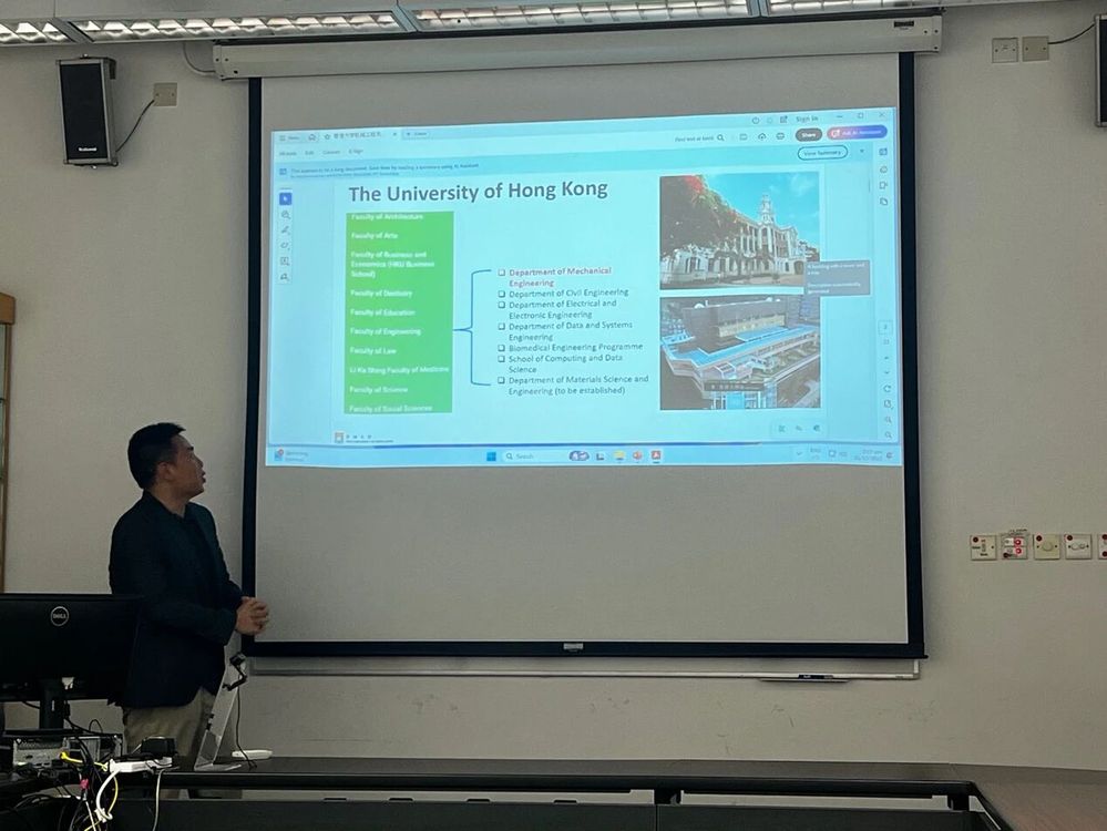 在香港大学土木工程系郭颂怡教授和机械工程系李潇凡教授的热情接待下,师生一行开启了校区参观,参观了具有标志性的百周年校园红墙,讲解人员介绍,这一片红砖建筑群不仅见证了港大百余年的发展历程,也体现了英伦风格与现代设计的融合。墙上镶嵌的校徽与纪念标志,象征着传承与创新的交汇。在这里,大家深入了解了香港大学的历史沿革、建筑风格及其文化底蕴,对学校“中西汇通”的教育理念有了更直观的感受。