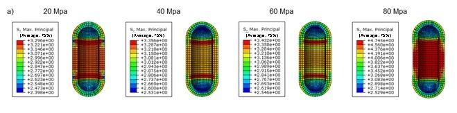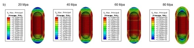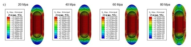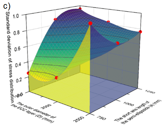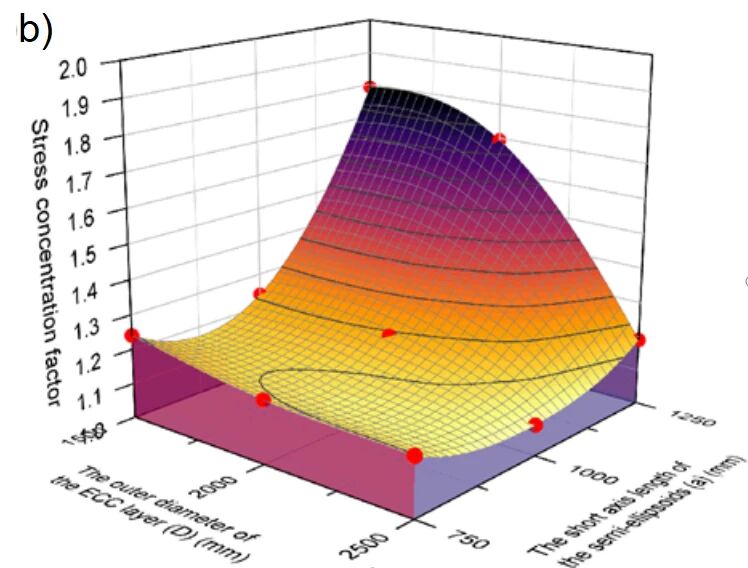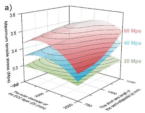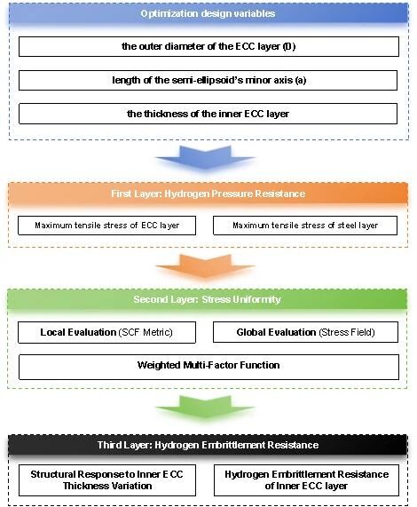 核心研究发现,拓扑优化后(M-2000-750模型),应力集中因子最大值降低34.2%,应力分布标准差下降70.0%,ECC层体积减少23.1%。最大工作氢压从20-40 MPa提升至60 MPa,钢层应力保持在屈服强度内(<235 MPa),且80 MPa下ECC最大拉伸应力为4.988 MPa(低于极限5 MPa)。内层ECC(厚度20mm)基于Fick定律延迟氢渗透至钢层达316年。ECC替代混凝土减少钢层厚度19.7%,整体重量降低17.8%,钢材成本下降17.76%。